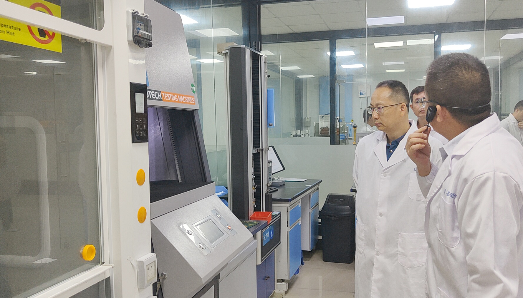 接着,企业代表为领导一行详细讲解了J9直营集团新材耗资超千万打造的CNAS国家认证实验中心。实验中心设有原料实验室、动态实验室、低温及电化学实验室、化学分析室、RoHS检测室、测量室、臭氧及燃烧实验室、热老化实验室和橡胶工艺室,配备了仪器设备百余套,含盖原料检测、配方验证、尺寸测量以及样品测试,可进行电器、汽车、连接器等行业各类标准实验,获得领导一行对企业创新、研发技术的赞赏和肯定!