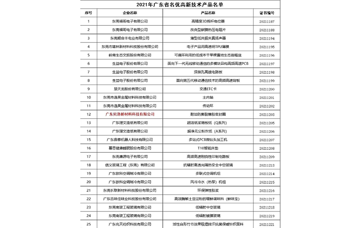 2022年2月22日上午,广东省高新技术企业协会发布了《关于公布2021年广东省名优高新技术产品名单的通知》,东莞市申报项目平均通过率16.8%,其中,东莞市高新技术产业协会48家会员单位73项产品获评2021年广东省名优高新技术产品,通过率27.4%,广东J9直营集团新材料科技有限公司顺利入选,热烈祝贺以下入选会员单位。