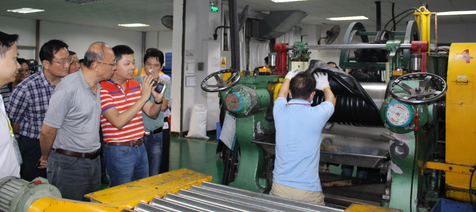在董事长苏会敏的带领下,领导们首先来到公司会议室,听取了针对公司近年来发展状况、发展方向和投资等情况的详细介绍。介绍完后,一行领导先后来到工程试验研发中心、硫化成型、开炼等区域进行现场参观。在参观过程中,制造总监苏方云先生向领导们详细介绍了产品原料、生产工艺流程、质检流程等。