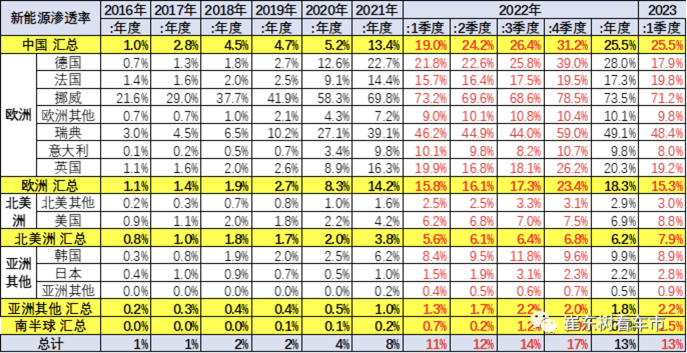 崔东树指出,世界新能源车渗透率总体呈现快速提升趋势,2022年4季度已经达到17%水平,2023年1季度达到13%,其中中国新能源渗透率达到25%,德国达到18%,挪威达到71%,美国仅有8.8%,日本仅有3%,因此世界新能源发展的不均衡性极为明显。随着中国继续强化新能源发展,美国加大新能源的鼓励政策,世界新能源车进入强势发展的新阶段。