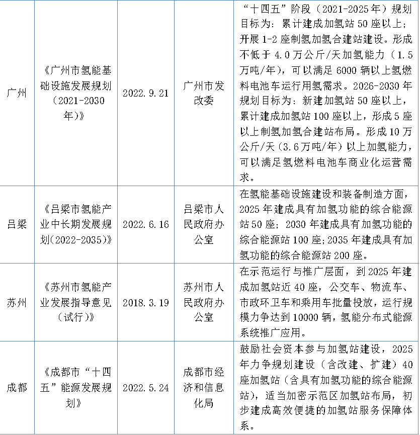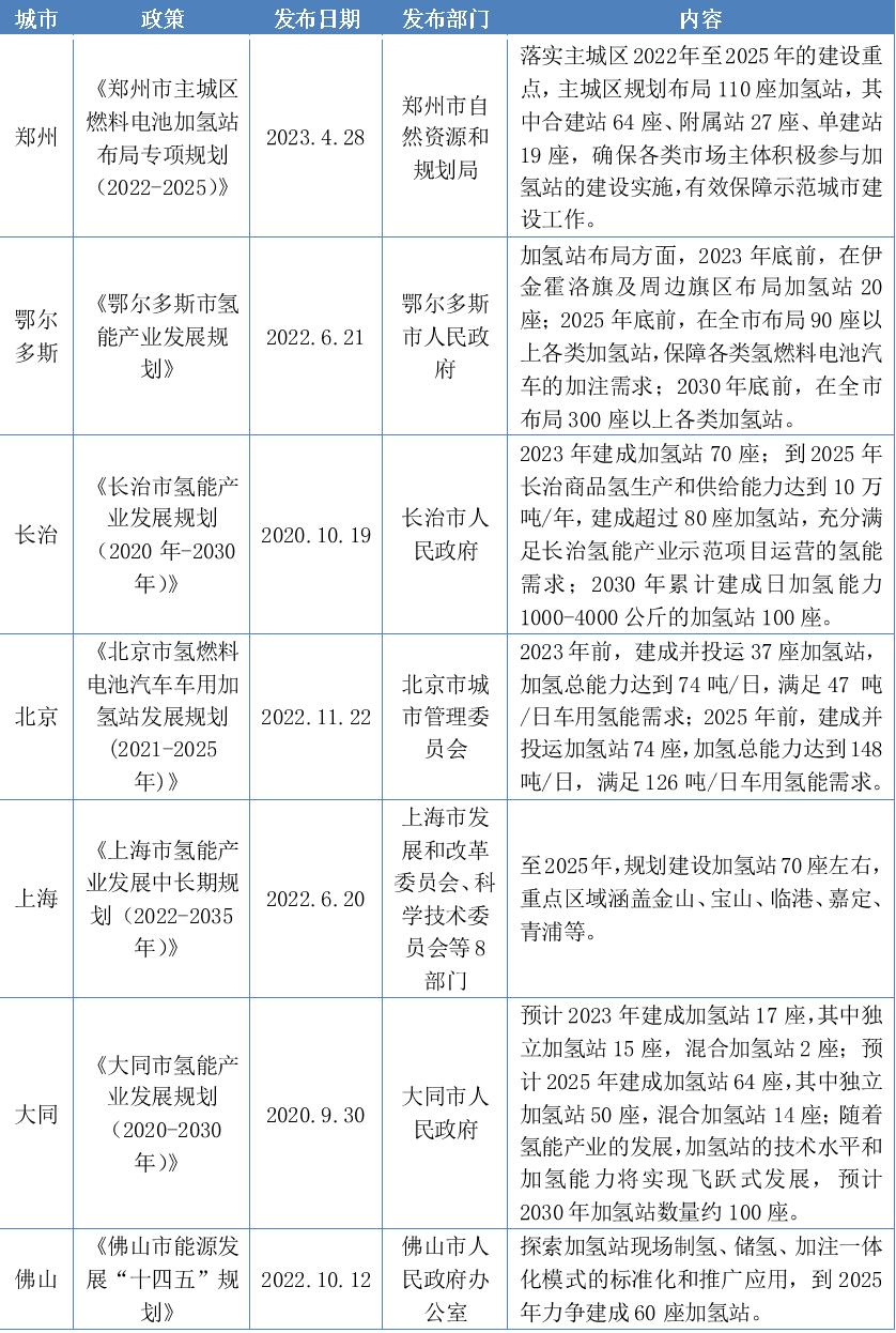 表 1:2025年加氢站规划数量TOP10城市出台政策详情