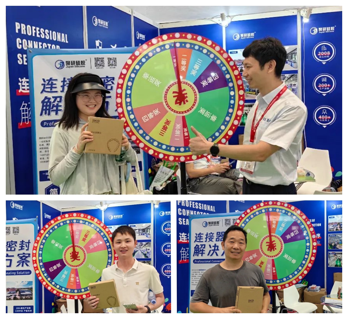与此同时,聚研硅胶凭借着对连接器一站式解决方案服务的过硬实力,征服了行业一众合作伙伴,各知名企业对与聚研的充满信心,纷纷踊跃交换信息,寻求合作并参与到现场的抽奖活动中。