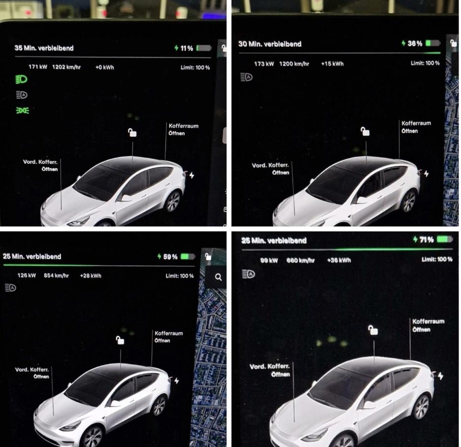 有用户分享了这款车型的实测充电功率数据,刀片电池版本的Model Y充电峰值功率达到170kW以上,15分钟就能从11%充至71%。对比宁德时代版本,可以看到比亚迪版本的高功率充电时间维持的更长,充电功率也比较高。