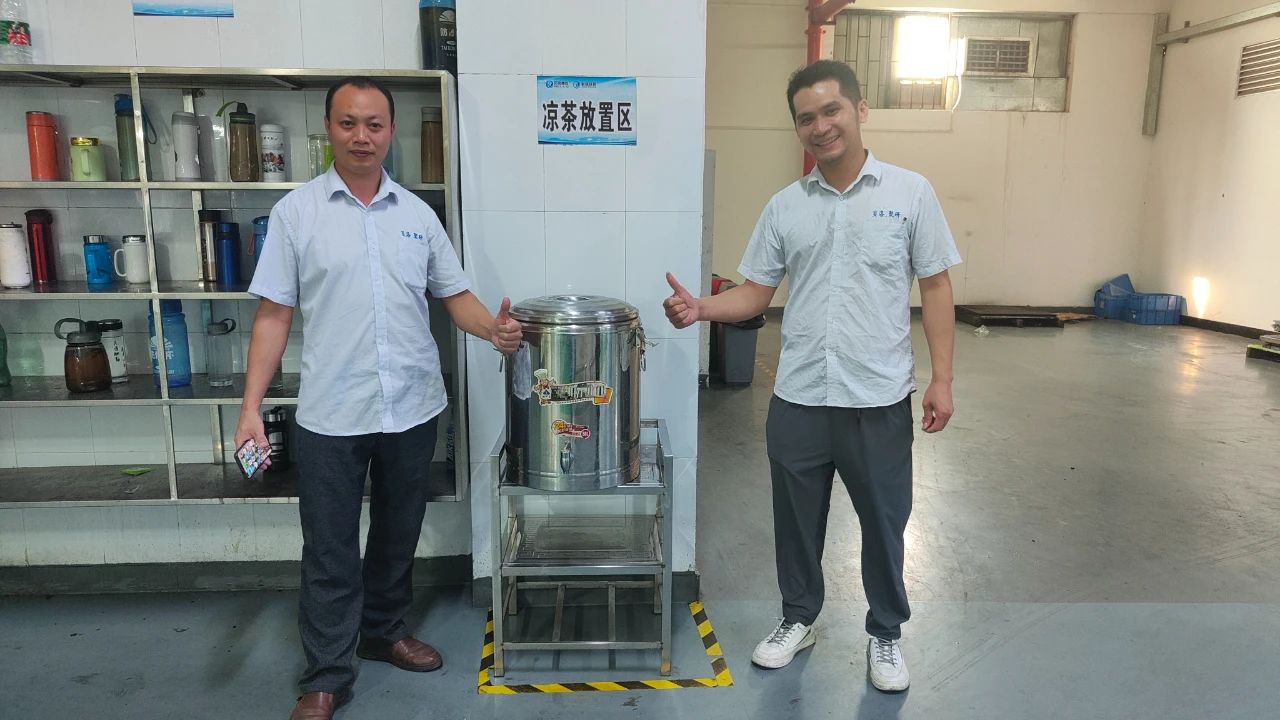 凉茶用纯中药配方熬制,解暑效果好,味道清甜!员工们纷纷表示,虽然天气闷热难受,却能感受到公司对员工的心意,既暖心又清凉。